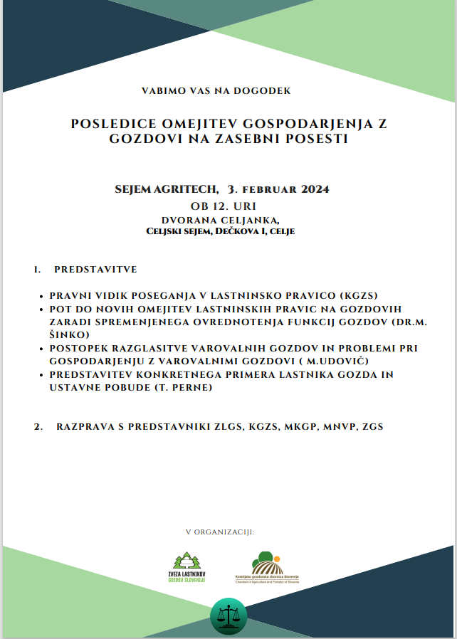 V soboto 03.02. 2024 je ZLGS skupaj z KGZS pripravila dogodek: Posledice omejitev gospodarjenja z gozdovi na zasebni posesti Dogodka so se udeležili zanimivi govorci: dr. Milan Šinko, Marko Udovič, Teos Perne in Miha Koprivnikar. Zbrane je so pozdravili Roman Žveglič preds. KGZS, Marjan Hren preds ZLGS in Gozdarska Kraljica Slovenije Andreja Vidmar.