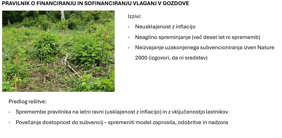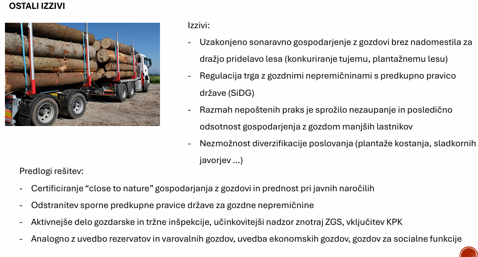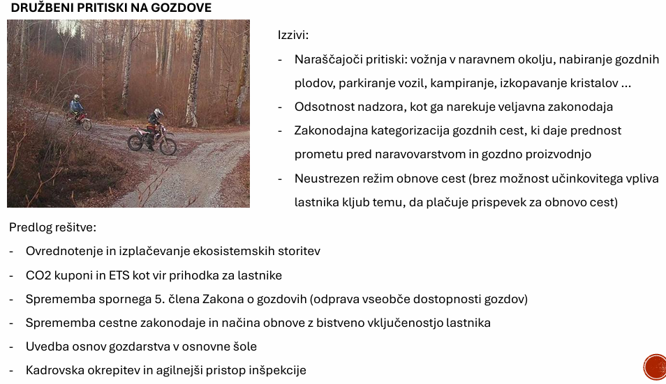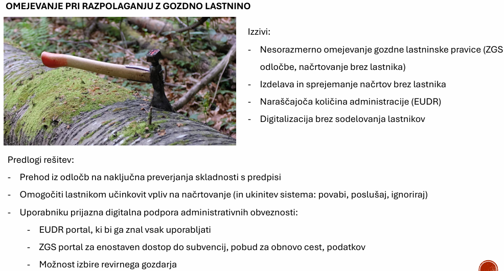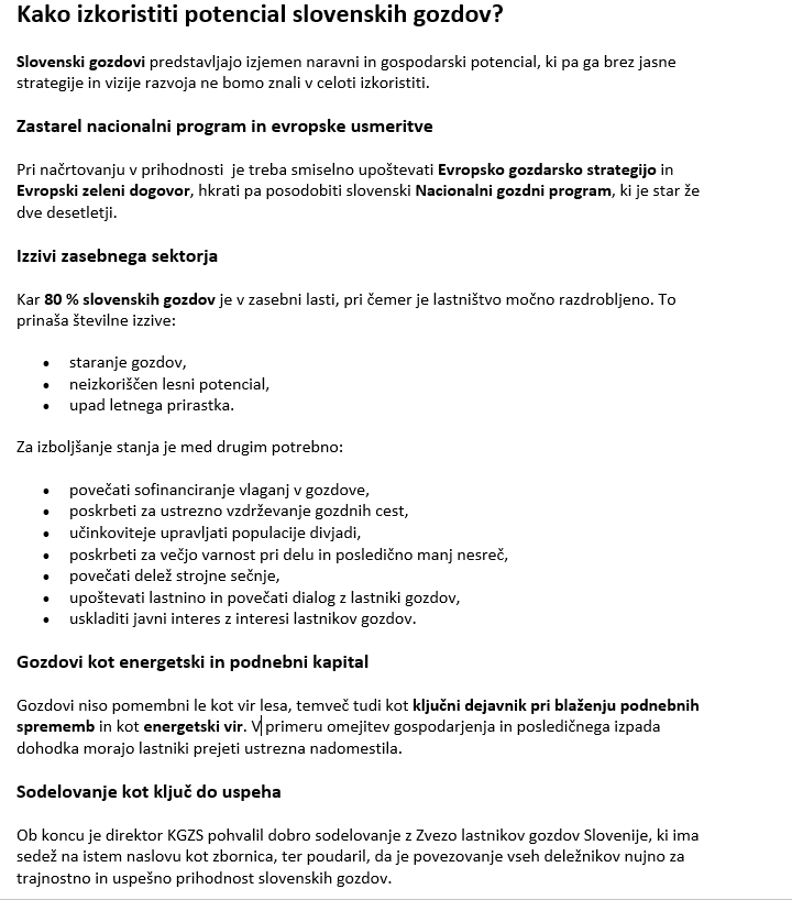 "Danes smo tukaj na posvetu zbrani poleg lastnikov gozdov še strokovnjaki MKGP, ZGS, Inšpektorat za gozdove, stanovske organizacije lastnikov gozdov KGZS in ZLGS na enem mestu in ob eni najpomembnejših tem-Aktivno gospodarjenje z gozdovi, kar me izredno veseli. Verjemite mi, da je to velik dosežek našega dela ZLGS v preteklih 10 in več letih, da skupaj z našimi partnerji iščemo strokovne rešitve. Rad pa bi poudaril, da zaenkrat še nismo uspeli argumentirano prodreti na nivo odločevalcev in politike in tudi ne prepričati večinskega dela slovenske javnosti o prepotrebnih spremembah zakonodaje glede na vse izzive in upravičene predloge nanizane v tem predavanju. Tu nas pa čaka še veliko resnega dela."